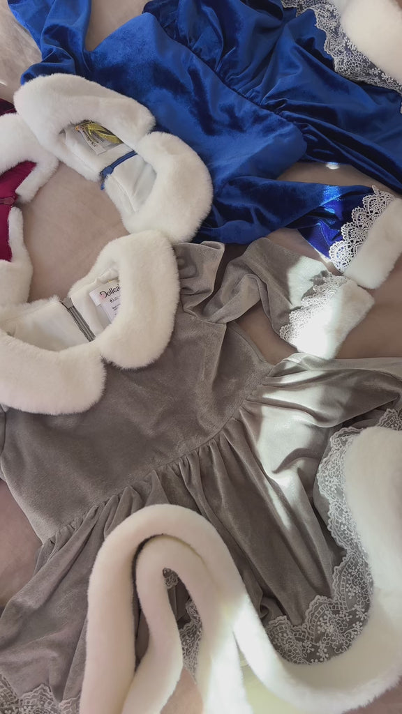 This dress features plush white faux fur trim along the collar, cuffs, and hem for a cozy, wintery touch and delicate white lace embroidery adorning the skirt and sleeves, adding a graceful, snowflake-like detail. The back is identical and features a hidden zipper for easy wear.